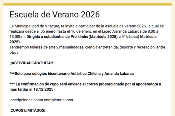 Lunes a viernes de 5 al 16 de enero de 2026 desde las 08:00 a las 13:00 horas en el Liceo Bicentenario Amanda Labarca.